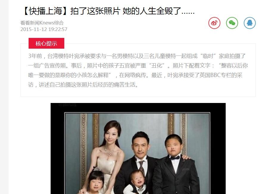 据看看新闻2015年11月12日文章《拍了这张照片 她的人生全毁了……》阐述:3年前,台湾模特叶宛承被要求与一名男模特以及三名儿童模特一起组成“临时”家庭拍摄了一组广告宣传照。事后,照片中的孩子五官被严重“丑化”。照片下配着文字:“整容以后你唯一要做的是跟你的小孩怎么解释”,在网络疯传。
