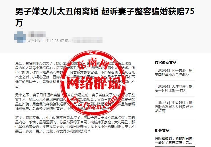 冯健以妻子太丑为由申请离婚获赔75万?记者核实系彻头彻尾的假新闻