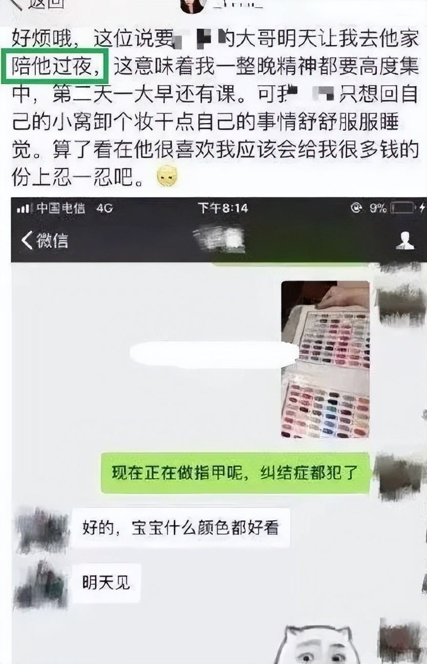 最近,我在网上看到一篇文章,一个女生分享了自己从好学生变成被“包养女”的故事。说的是该女学生因为对有钱家庭的同学高消费的羡慕,也为了追求高品质的生活,选择“弯道超车”,找人被“包养”。并且有的同学认为这也是一个自己赚钱养活自己的方式,不以为然。有几组图片,可以看看。