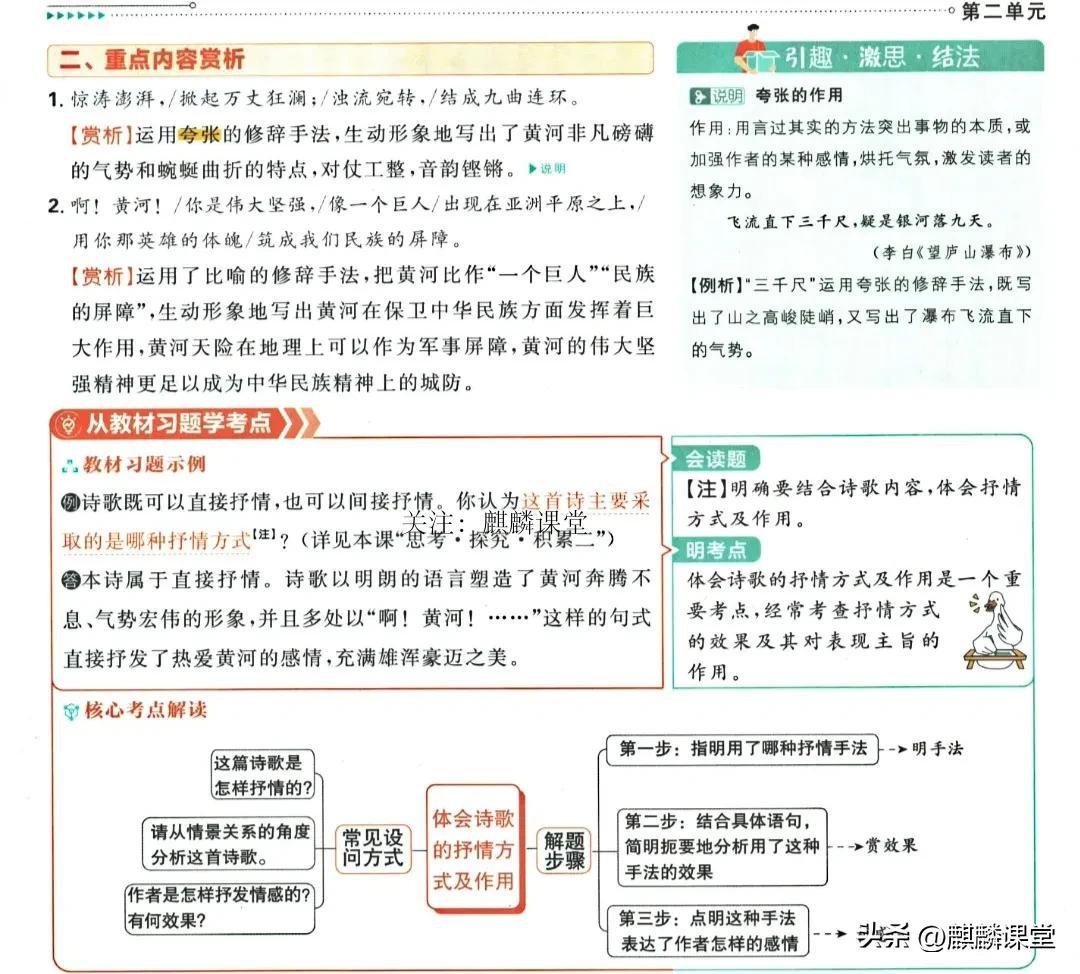 诗歌赏析部分更是精华所在。它把《黄河颂》分成序曲、主体、尾声三个部分,进行了深入剖析。序曲中,诗人开宗明义,指出黄河表现出我们民族伟大而坚强的精神,运用拟人手法,赋予黄河人的精神品质,让黄河的形象一下子鲜活起来。主体部分,一个“望”字统领下文,从“我站在高山之巅”到“劈成南北两面”,描绘了黄河滚滚奔流、惊涛澎湃、九曲连环的雄伟气势,使用“滚滚”“奔向”“惊淘澎湃”等词语,生动地展现出黄河的磅礴力量。颂黄河部分,从黄河养育了中华民族、保卫着中华民族、激励着中华民族三个方面,歌颂了黄河的伟大贡献。把黄河比喻成“中华民族的摇篮”,突出它对中华民族的孕育作用;比作“民族的屏障”,强调其在地理和精神上的保卫作用;“向南北两岸伸出千万条铁的臂膀”,则展现了黄河流域宽广,泽被众生的特点 。尾声中,诗人代表中华儿女发出向黄河学习的誓言,学习它伟大坚强的精神。