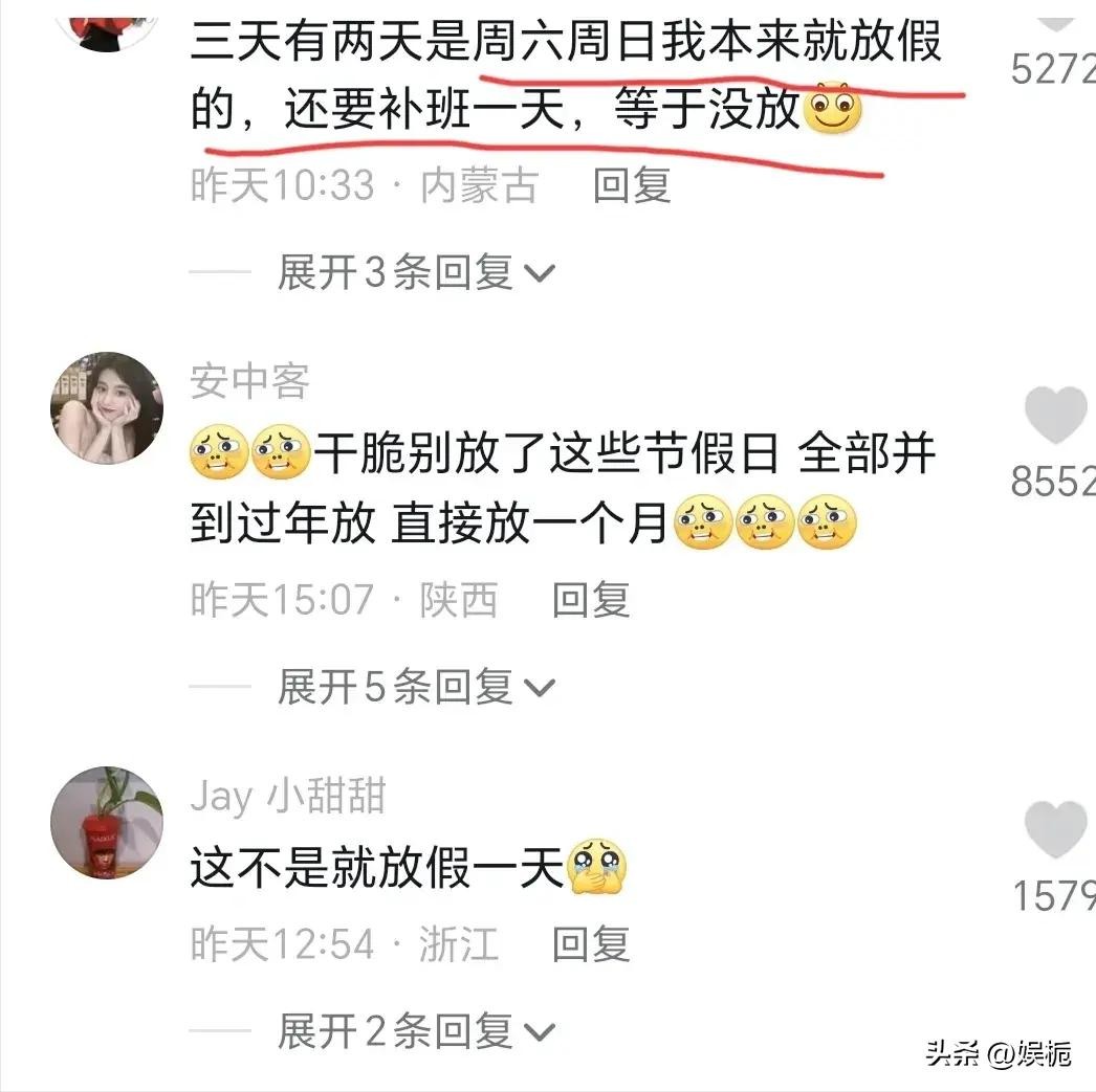 这假期的安排直接给网友们来了一场头脑风暴,就为了证明这个假期究竟是放假了还是没有放,很多人都不理解这假期究竟是谁安排的,这样的安排有什么意义?