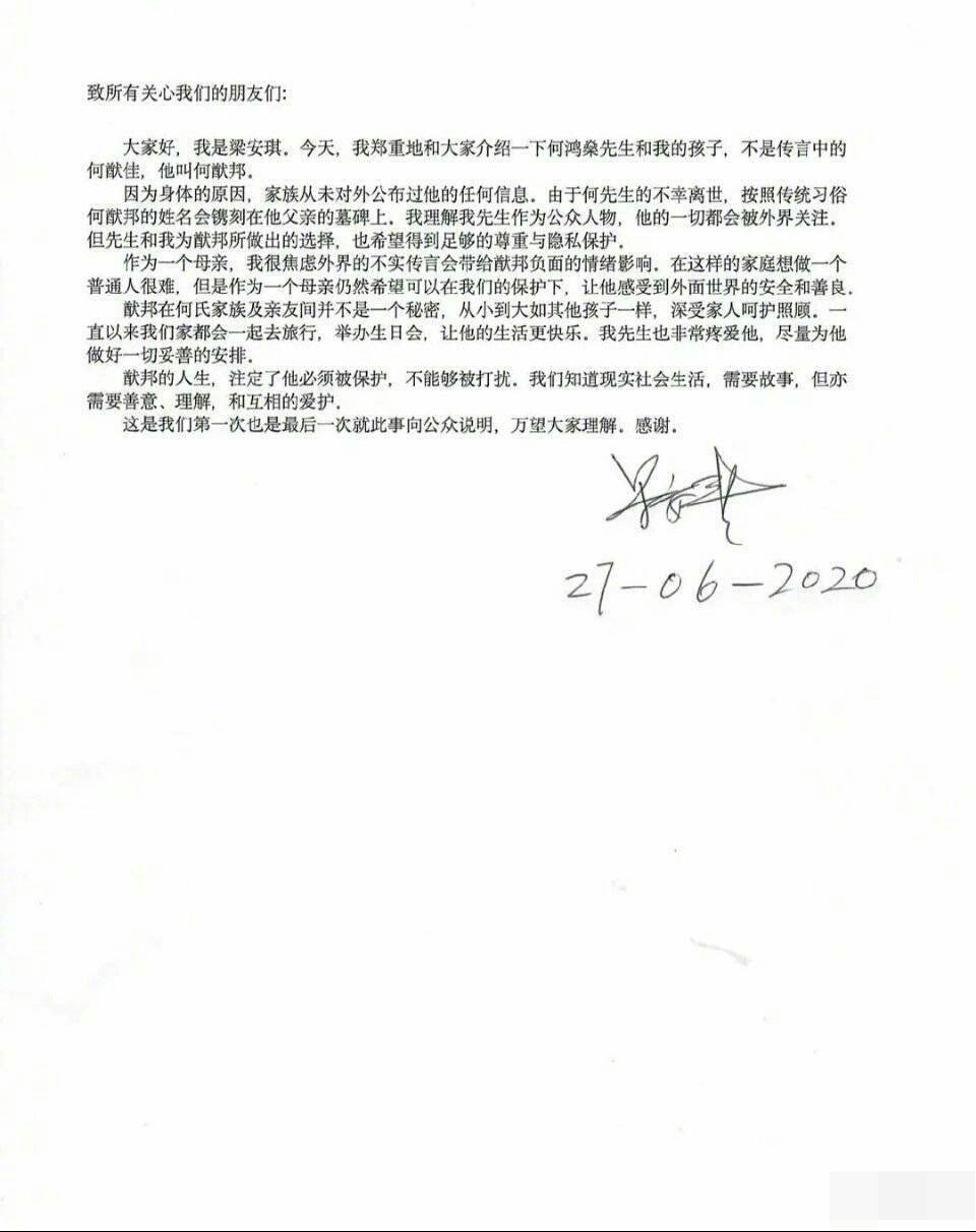 此外,何猷君曾经在社交媒体上自称“四哥”,而按照公开的子女排行,他应该是梁安琪的第三个儿子,这似乎也佐证了何猷邦的存在。