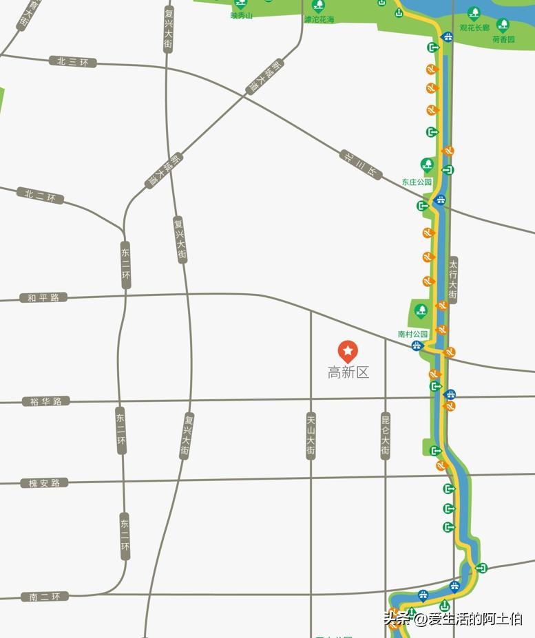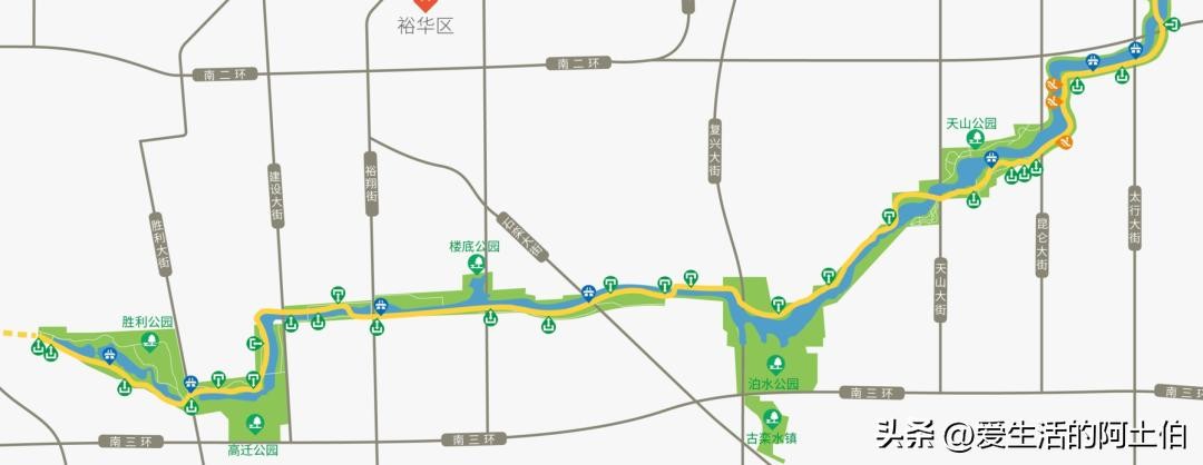 绿道南线沿环城水系建设,终点为胜利公园,途经天山公园、泊水公园、楼底公园、高迁公园、胜利公园。(注:高迁公园和胜利公园之间,跨胜利大街天桥因涉铁路,目前还未贯通)