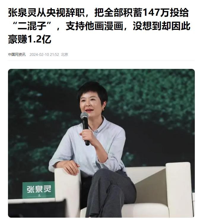 中国网资讯在2024年2月10日关于《张泉灵从央视辞职,把全部积蓄147万投给“二混子”支持他画漫画,没想到却因此。豪赚1.2亿》的报道