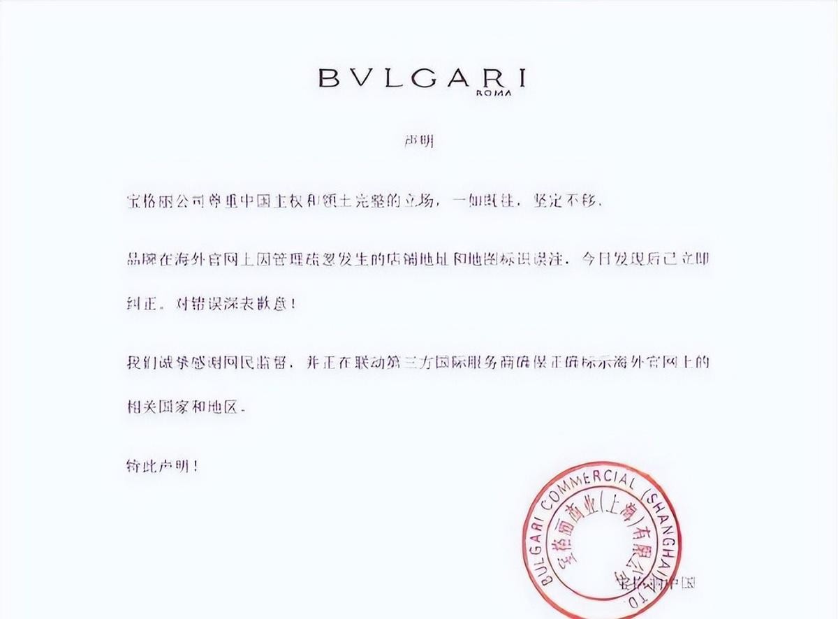 面对舆论关切,宝格丽在微博上公开表示,我们支持中国领土完整,对于之前的表述不够准确的地方诚恳道歉。