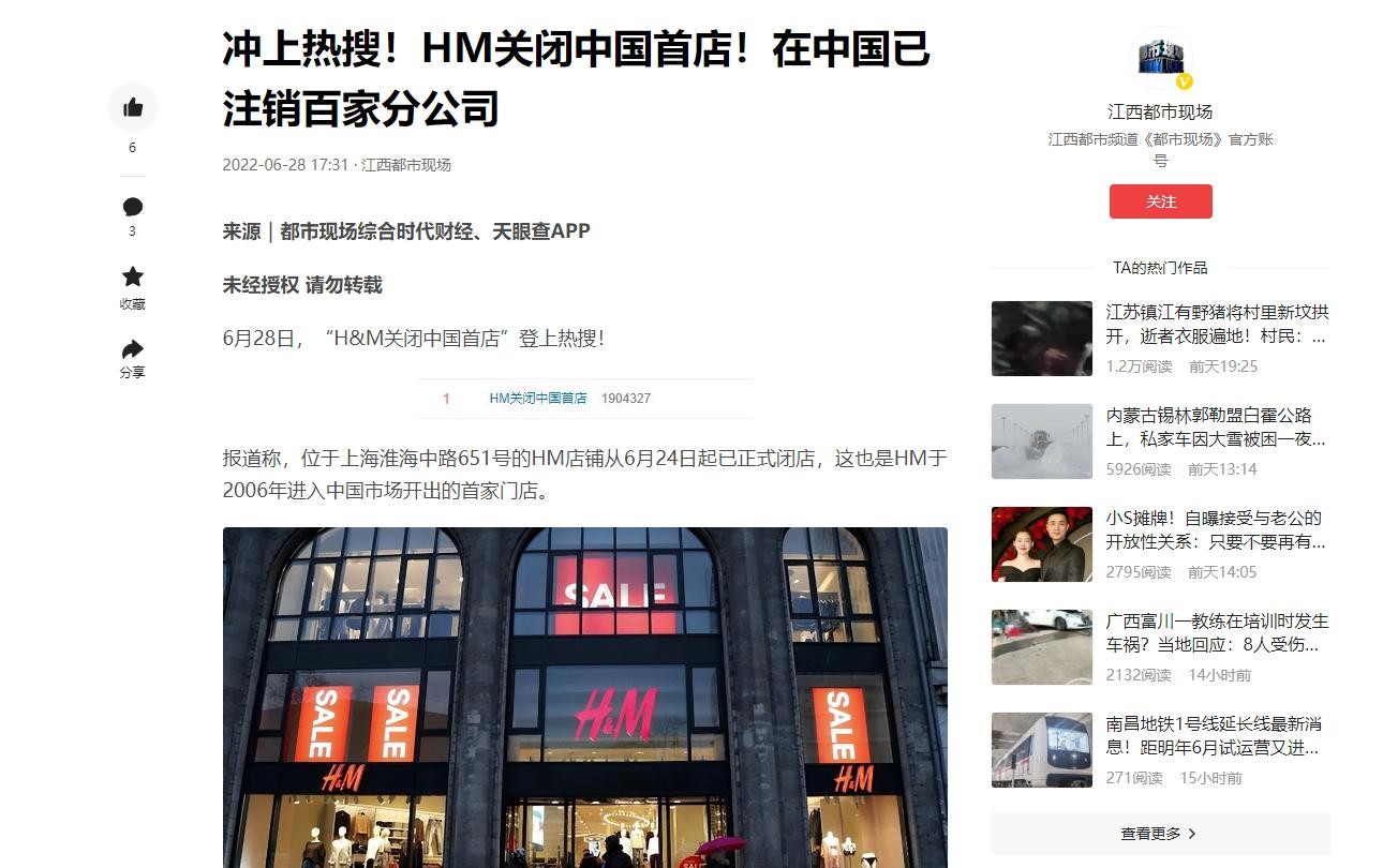 冲上热搜!HM关闭中国首店!在中国已注销百家分公司 2022-06-28 17:31·江西都市现场