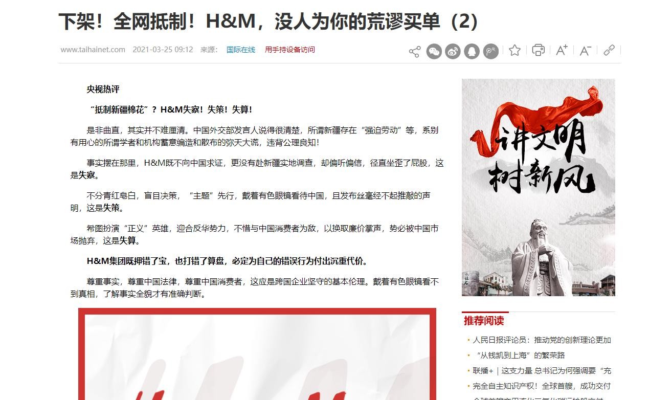 下架!全网抵制!H&M,没人为你的荒谬买单(2) 2021-03-25 09:12 来源: 国际在线