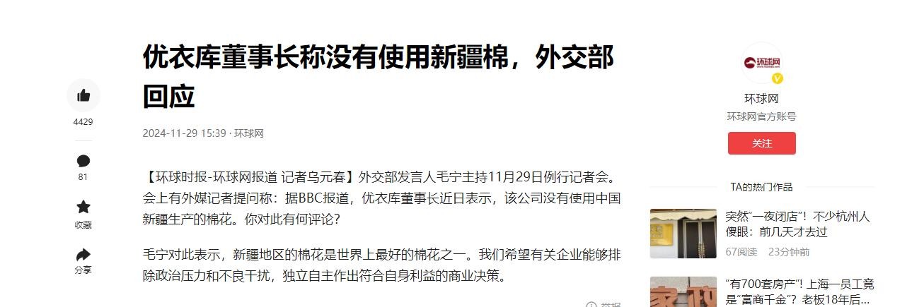 优衣库董事长称没有使用新疆棉,外交部回应 2024-11-29 15:39·环球网