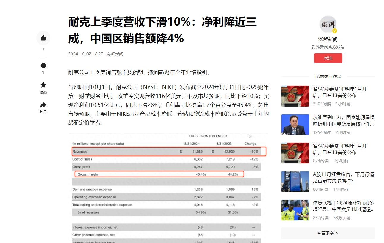 耐克上季度营收下滑10%:净利降近三成,中国区销售额降4% 2024-10-02 18:27·澎湃新闻