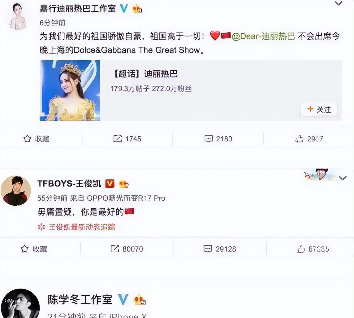 受邀参加大秀的明星纷纷表示拒绝出席,品牌大使迪丽热巴和王俊凯也迅速与D&G解约,各大电商平台和免税店也下架了D&G的相关产品。