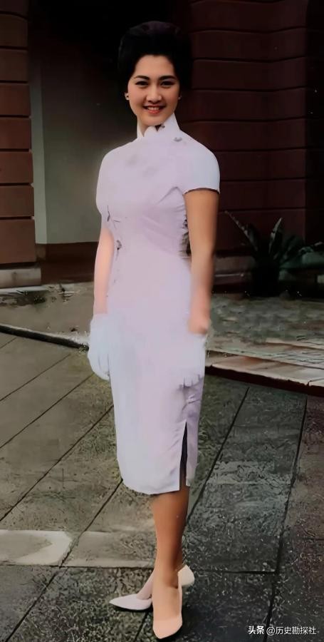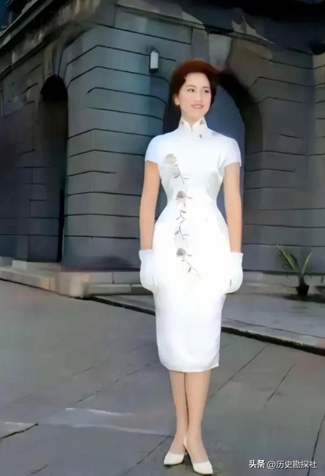 这是一张她年轻时的珍贵照片,她身穿一袭白色旗袍,脚穿白色高跟鞋,手上带着白色手套,一身白色系的搭配显得她格外柔美,年轻时的她容貌绝美,美艳动人,堪比神仙下凡。