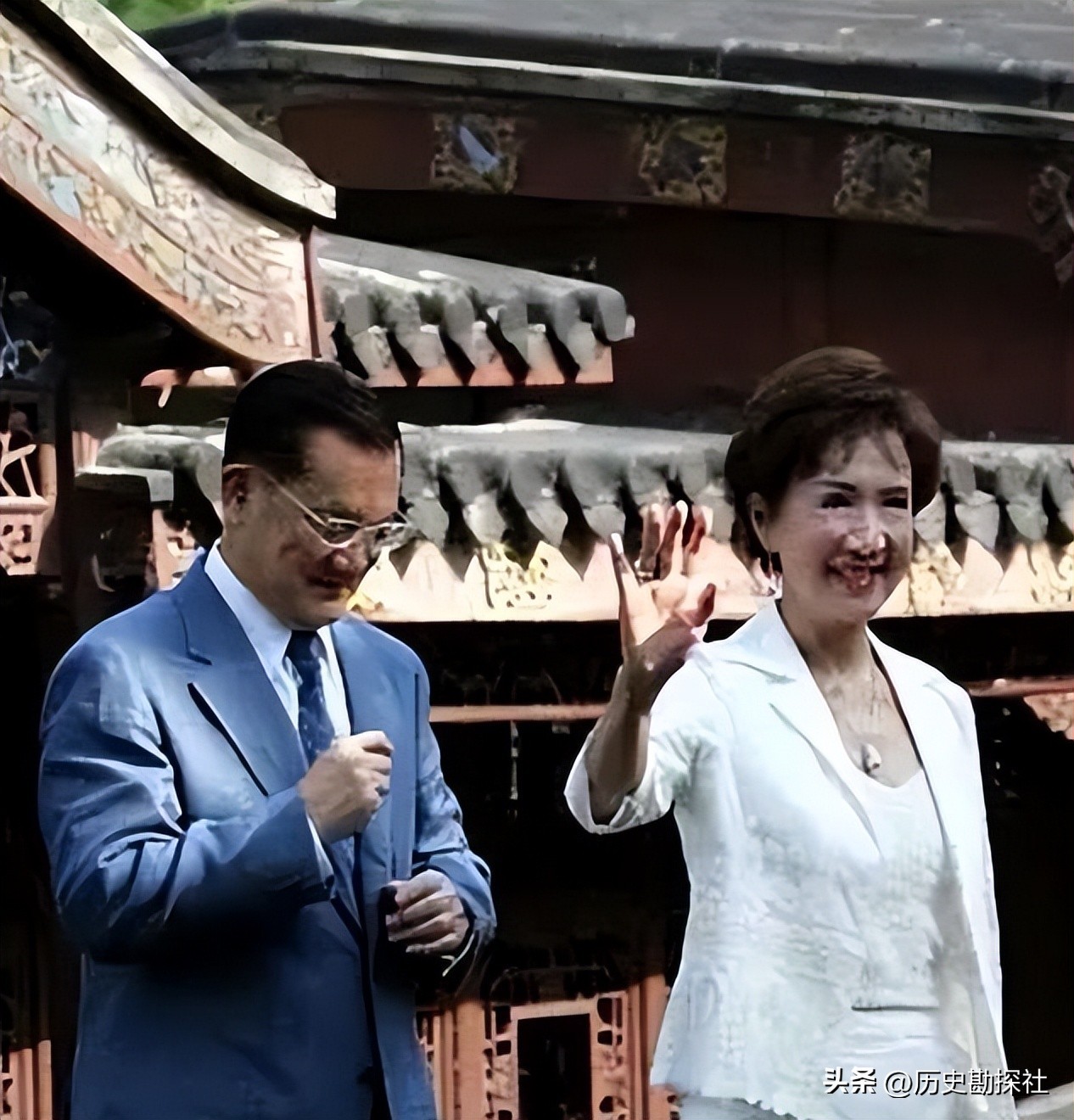 镜头前的连战身着浅色西装,戴着墨镜,显得精神十足、潇洒不凡,他的妻子连方瑀与丈夫着装相衬,一袭白色旗袍,将其精致的五官衬托得更加出众,不得不说,这一对夫妻从气质到容貌,都是天造地设的一对,这一年连战32岁,而方瑀只有25岁。