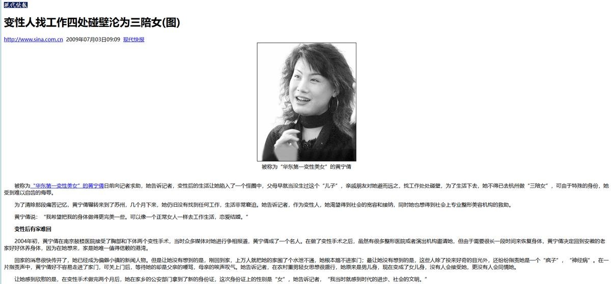 2.现代快报2009.07.03《变性人找工作四处碰壁沦为三陪女》