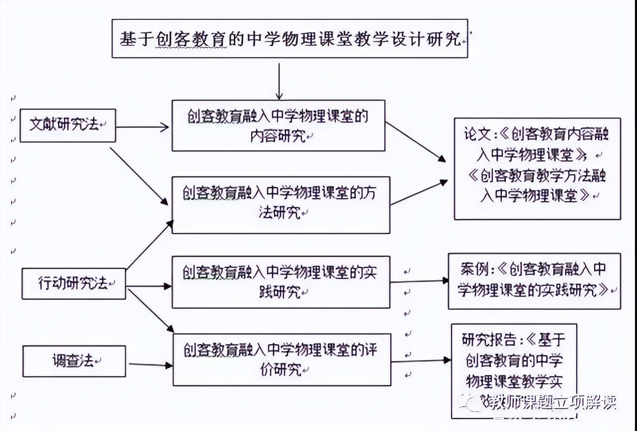 1.主体部分的中间是课题研究的内容,确定了四个研究内容,分别是创客教育融入中学物理课堂的内容研究、方法研究、实践研究、评价研究。并且,我们可以看出,四块研究内容从上到下的排序是有先后的,这体现了研究的思路。