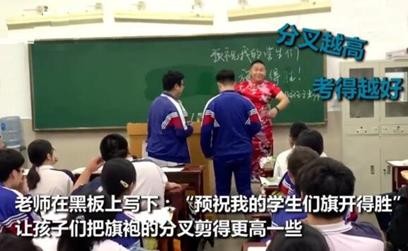 1、男老师穿旗袍祝高三学生旗开得胜 5日,辽宁丹东,敬业实验高级中学的男班主任王礼博,穿上了大红旗袍走进教室,祝福孩子们高考旗开得胜。他还邀请孩子们一人在旗袍上剪一刀,寓意叉越高分越高。(@一手Video)