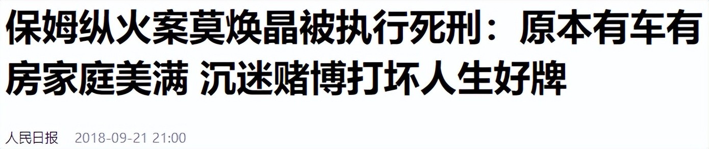 人民日报——保姆纵火案莫焕晶被执行死刑:原本有车有房家庭美满 沉迷赌博打坏人生好牌