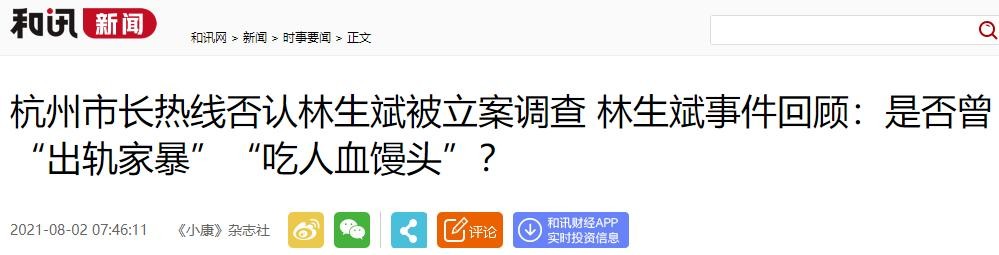 和讯新闻——杭州市长热线否认林生斌被立案调查 林生斌事件回顾:是否曾“出轨家暴”“吃人血馒头”?