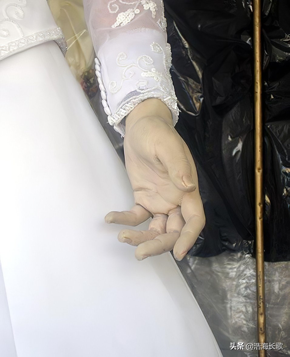 蜡像虽然历史悠久,但惧怕高温和阳光直射,这新娘直接在橱窗里,每天接受日晒达80多年,蜡像的可能性微乎其微。何况蜡像也难制作出那么细致的掌纹和指甲。