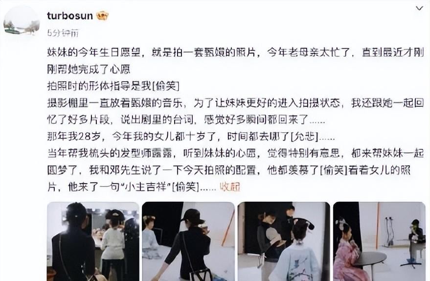 孙俪在社交平台表示女儿的生日愿望,是拍一套甄嬛的照片。