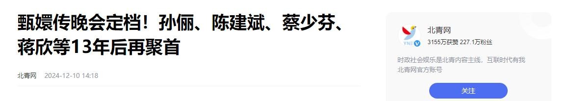 北青网:甄嬛传晚会定档!孙俪、陈建斌、蔡少芬、蒋欣等13年后再聚首