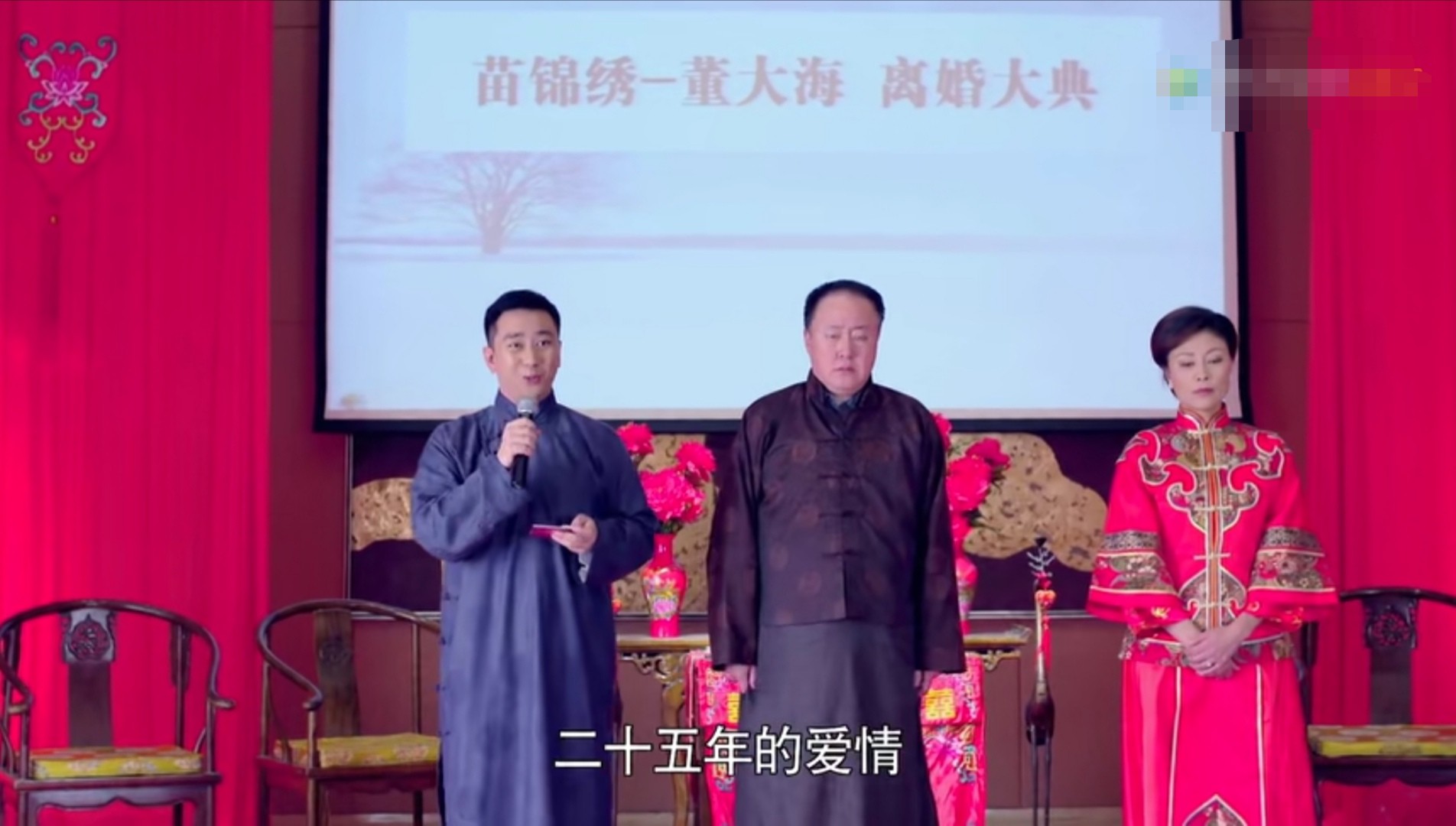 演讲结束,主持人请董大海把红盖头盖在苗锦绣头上,象征着25年的婚姻正式结束,从此后,秋云春水,千山暮雪,各自珍重。