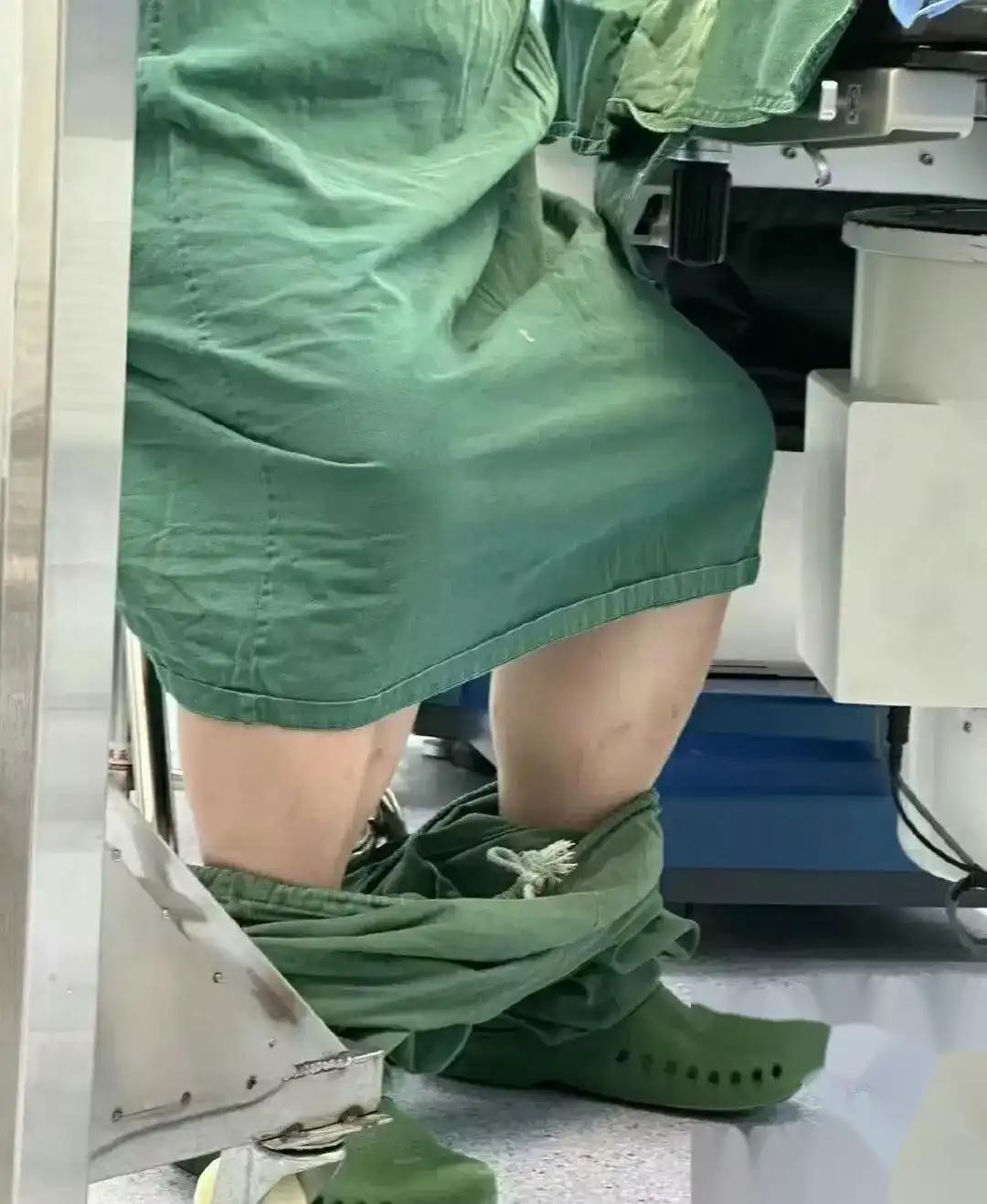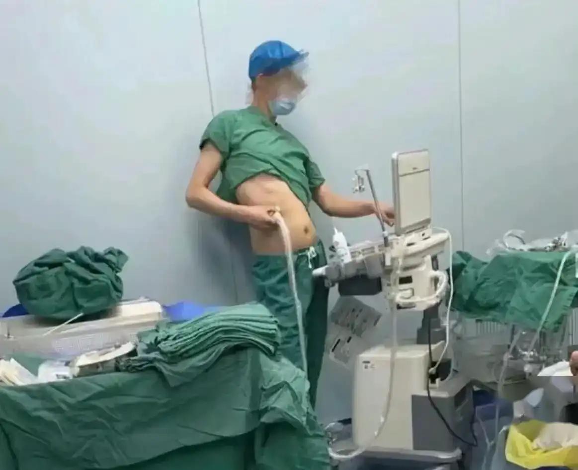 这是一家医院,而这位大叔正躺在病床上,似乎是在接受检查。
