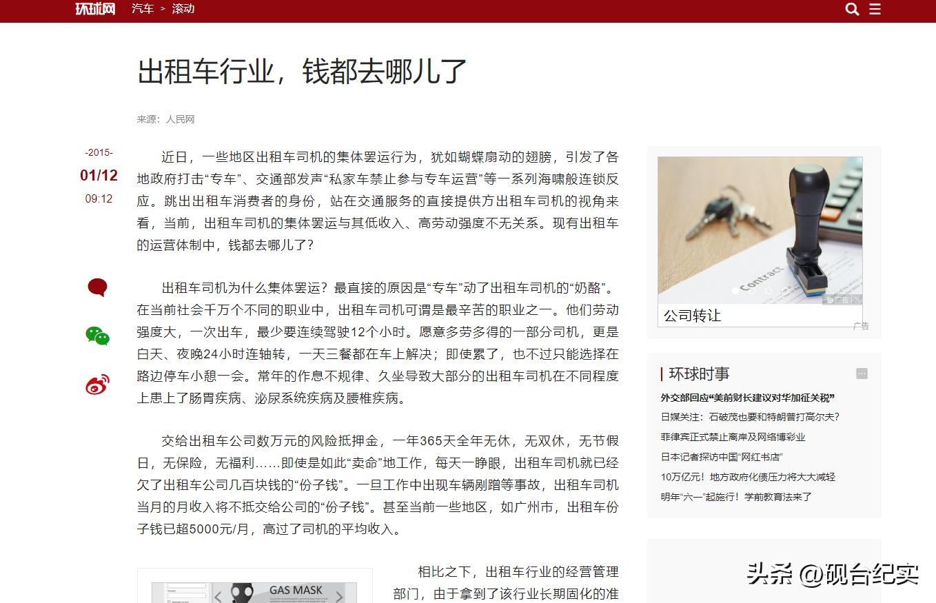 信息来源:环球网 2015-01-12 出租车行业,钱都去哪儿了