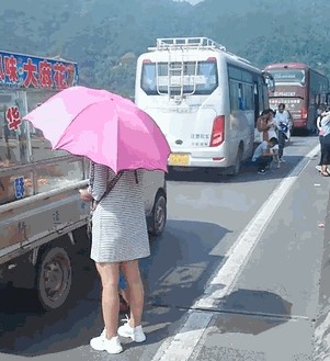 和执勤的交警隔空对视。