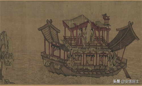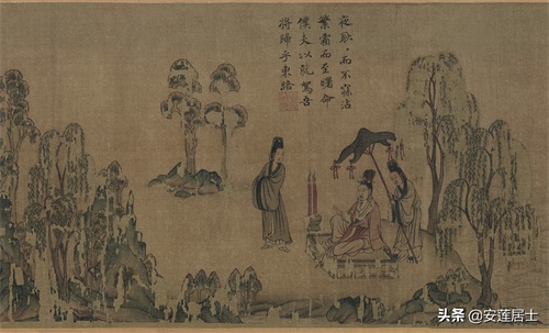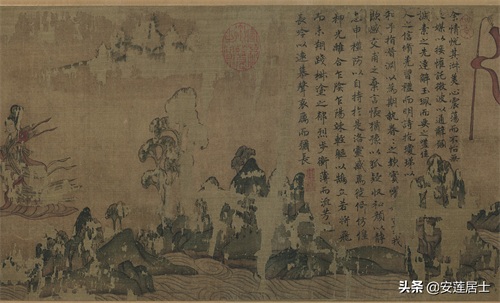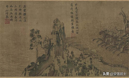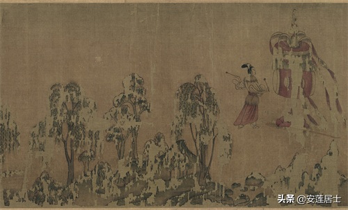 《洛神赋图》虽然主要表现的是人物,但山水作为背景却在画面当中占用了相当大空间,其发挥的作用也不容小觑:不仅点名了故事发生的地点烘托了气氛也使得画面很连贯的统一在一起。换一个角度理解,这种“人大于山”的绘画形式,反倒更好地突出了人物的形象,点明了主题。