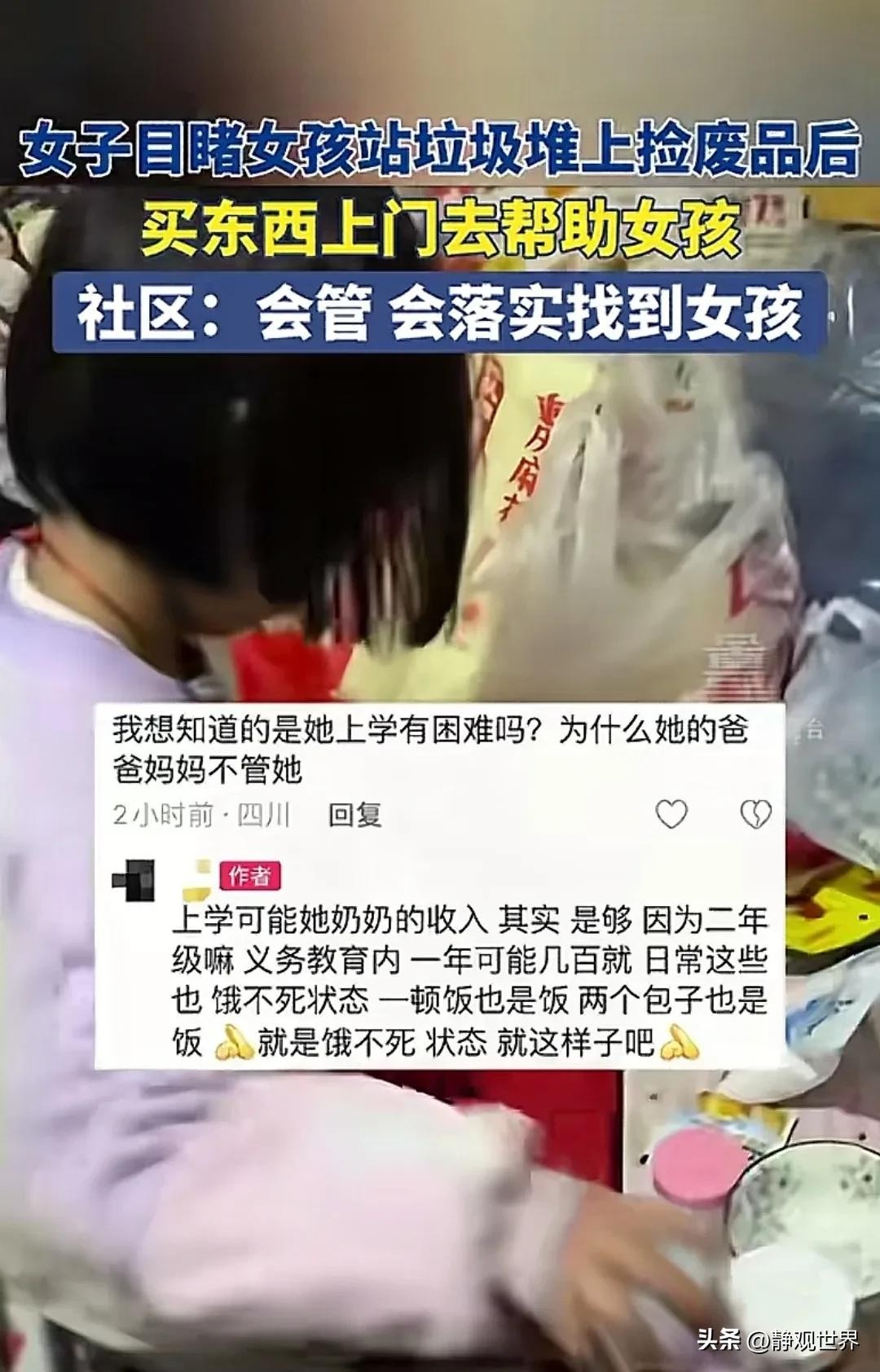 既然当地已经介入了,相信很快会有一个结果,希望孩子能够平安快乐成长吧,对此,大家如何看待此事?#居民目睹小女孩捡废品 社区回应#