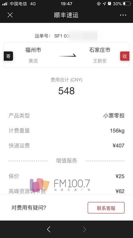 今年1月10号,黄先生再次使用顺丰快递往石家庄发了一件货物,这次由于物品比较重,运费达500多元钱。