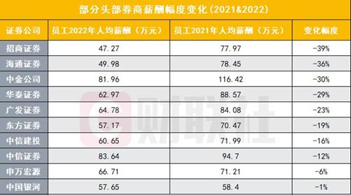 根据东方财富 Choice 数据,上市券商的平均年薪从 2021 年的 59.64 万元减少到了 2022 年的 48.32 万元。其中,头部券商的降薪幅度更大。招商证券(-39%)、海通证券(-36%)、中金公司(-30%)、华泰证券(-29%)、广发证券(-23%)降幅皆超过 20%。