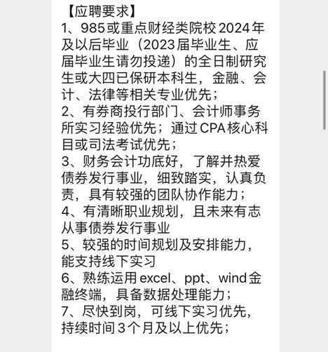 核心岗位实习生的要求越来越高,某券商债券承做实习生的应聘门槛是 985 或重点财经类院校的全日制研究生或已保研本科生;有券商投行部门、会计师事务所实习经验的优先;通过 CPA 核心科目或司法考试的优先。虽然部分券商会发放少量实习津贴或表示优秀者有留用机会,但多数券商的实习招聘信息里只是含糊的表示:能了解资本市场情况、提高研究能力、丰富实习经历等。