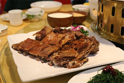 杞酒烤全羊 - 源自古代丝绸之路时期的传统美食,整只羊放在开放的炭火上烤制,搭配当地特色的杞酒,色泽红亮,油光肉嫩。