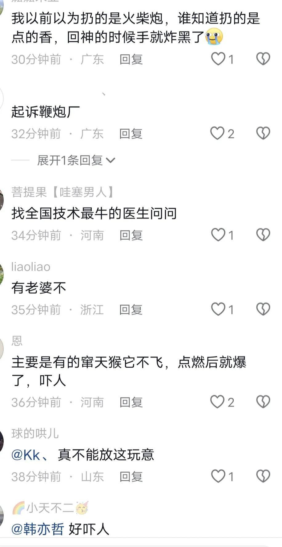 27岁的李先生最近因为放冲天炮而遭受了巨大的痛苦。他说当时以为没有点燃凑近一看就爆了。