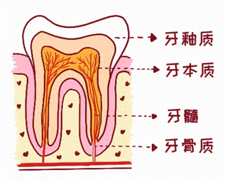 牙齿有三层硬组织和一层软组织,即牙釉质、牙本质、牙骨质和牙龈。