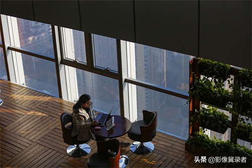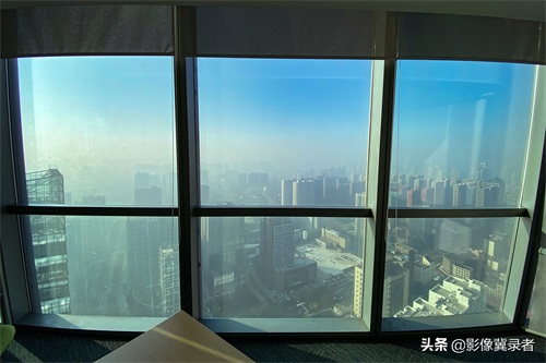11月18日上午10点,根据空气质量实时显示,当前为中度污染。随着楼层的增高,市区能见度和光照度有所提升,在44层写字楼高空,出现蓝灰两重天的景观。