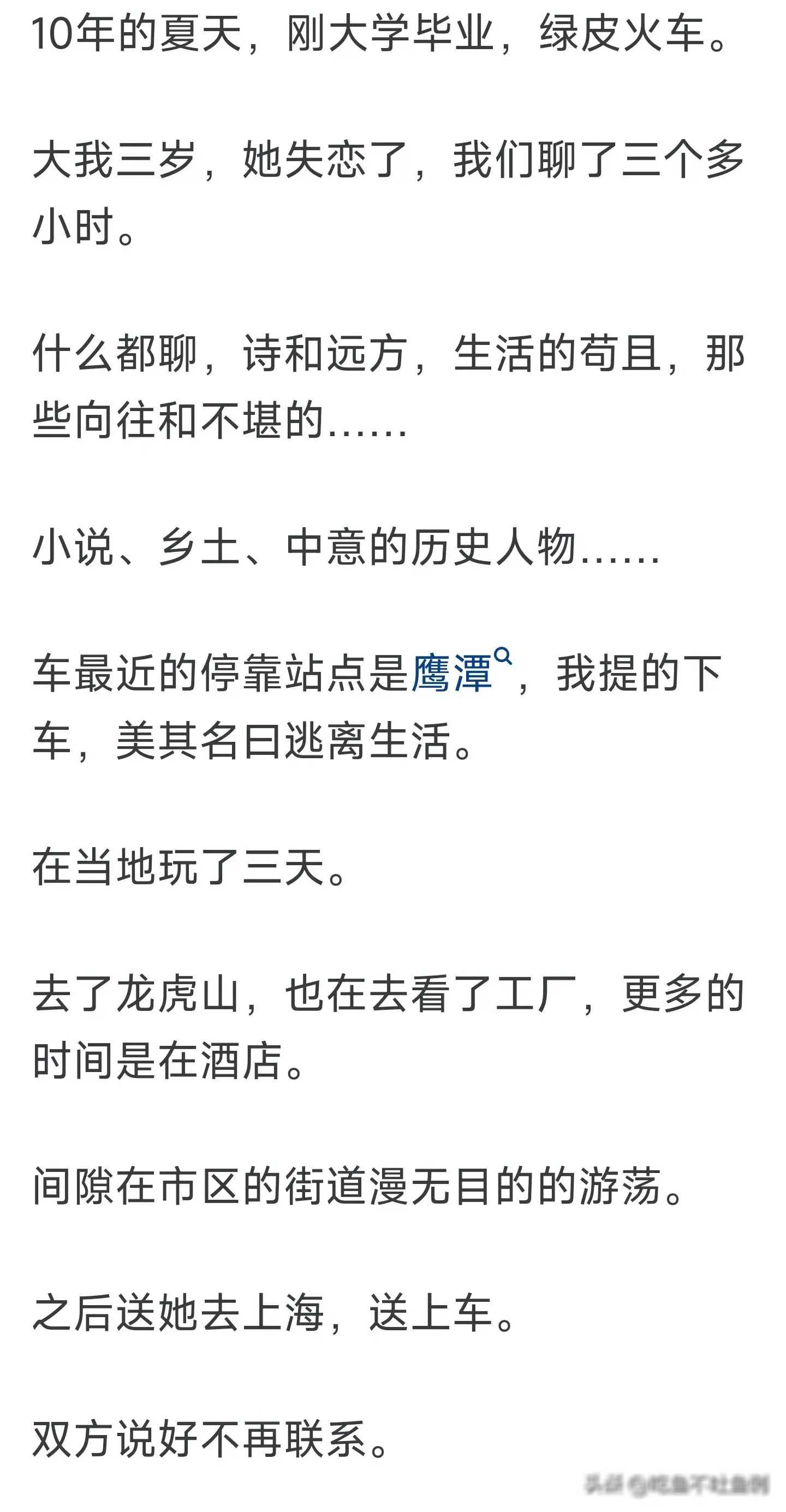 有的网友说,那次长途旅行中,他坐在窗边,看着窗外的风景一闪而过。突然,一个美丽的女孩坐在了他的对面,两人目光交汇,仿佛有一种神秘的力量在牵引着他们。他们开始聊天,从旅行趣事聊到人生理想,仿佛彼此是多年的老友。那次相遇,让他们都感受到了前所未有的心动。