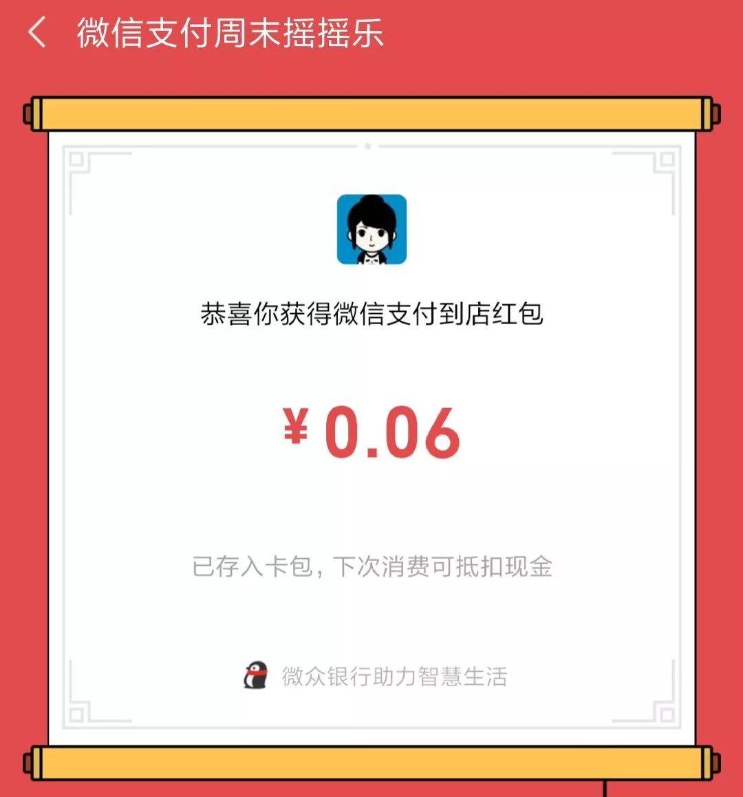 活动期间,使用微信付款后可获得到店红包,可在消费时抵扣现金。