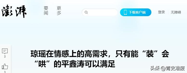 本文信源:澎湃新闻《琼瑶在情感上的高需求,只有能“装”会“哄”的平鑫涛可以满足》