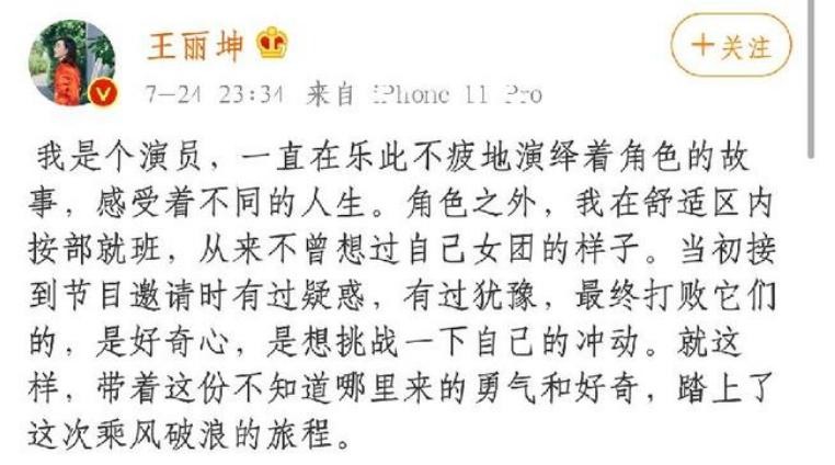 即使最后被淘汰了,依然不忘发文感谢节目组,点明自己当初来参加节目,也不过是想挑战一下自己的冲动,带着这份不知道哪里来的勇气和好奇,踏上了这次乘风破浪的旅程。