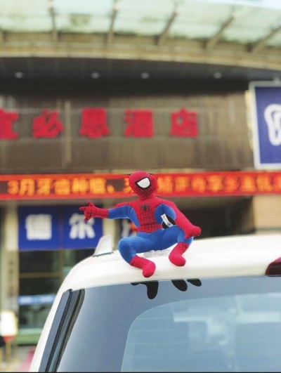 从今年年初,一些私家车车主开始将各种造型的玩偶,粘贴在车顶,其中“蜘蛛侠”、“超人”系列最多,非常夺人眼球,也使私家车的回头率飙升。