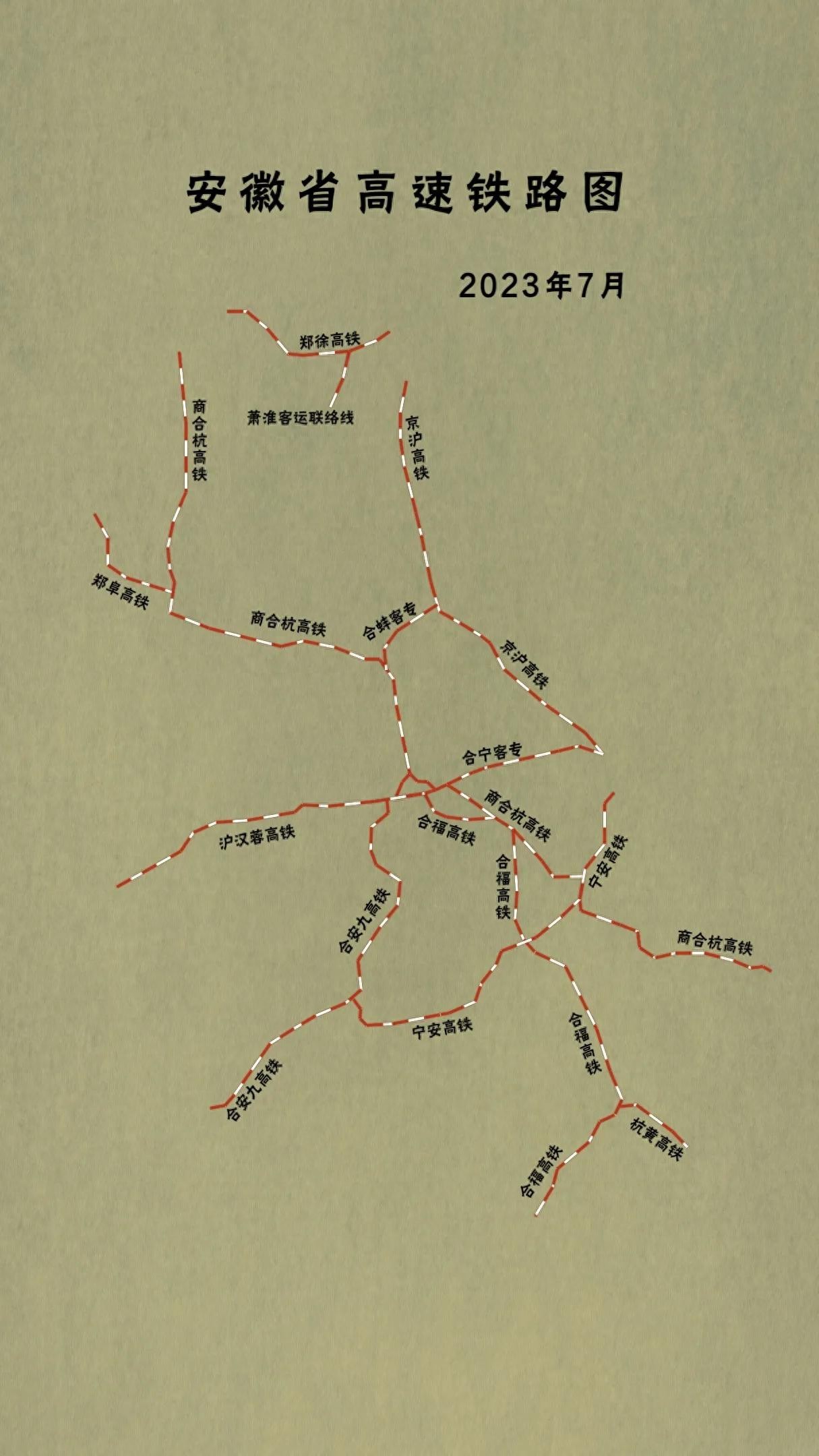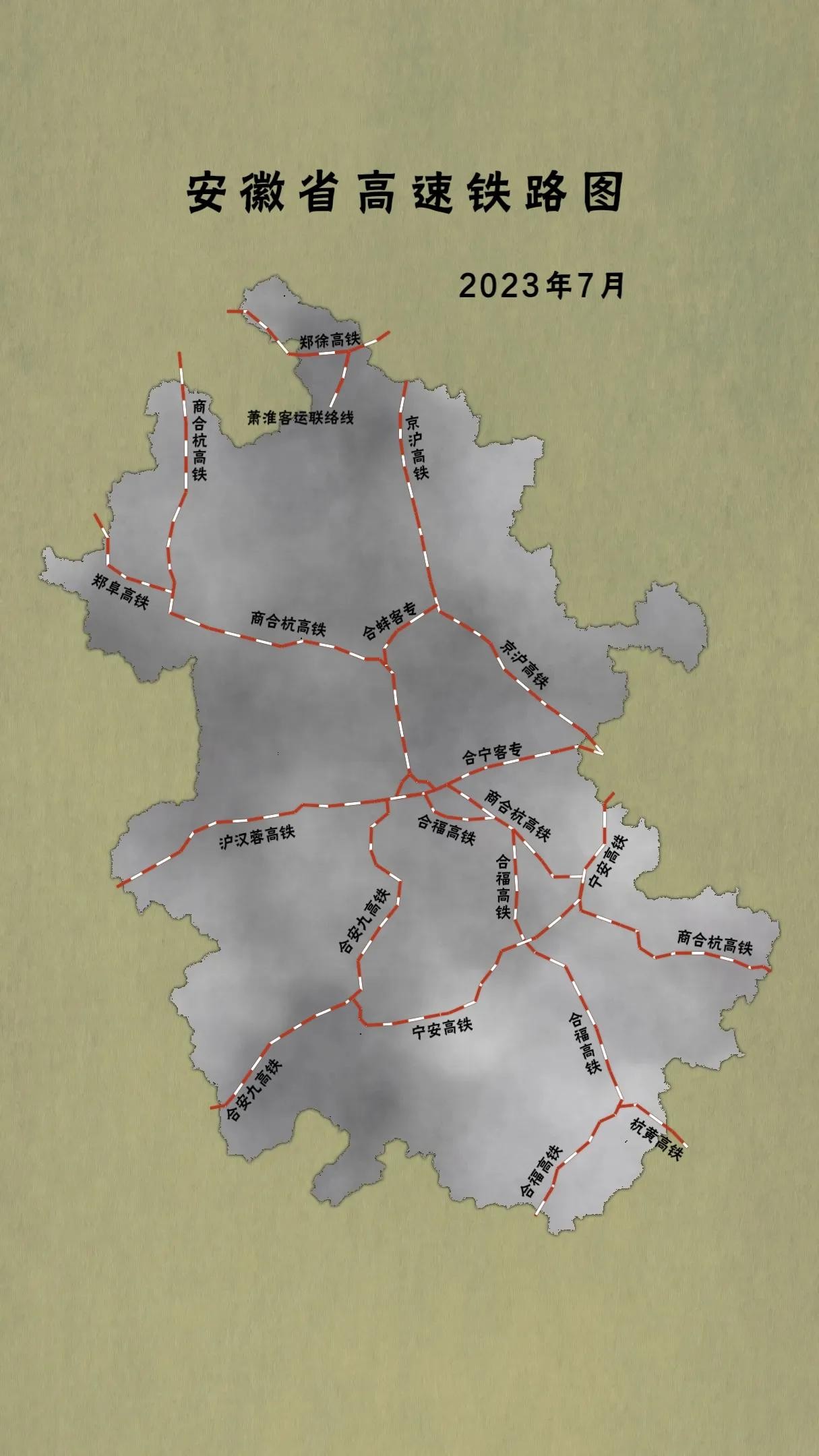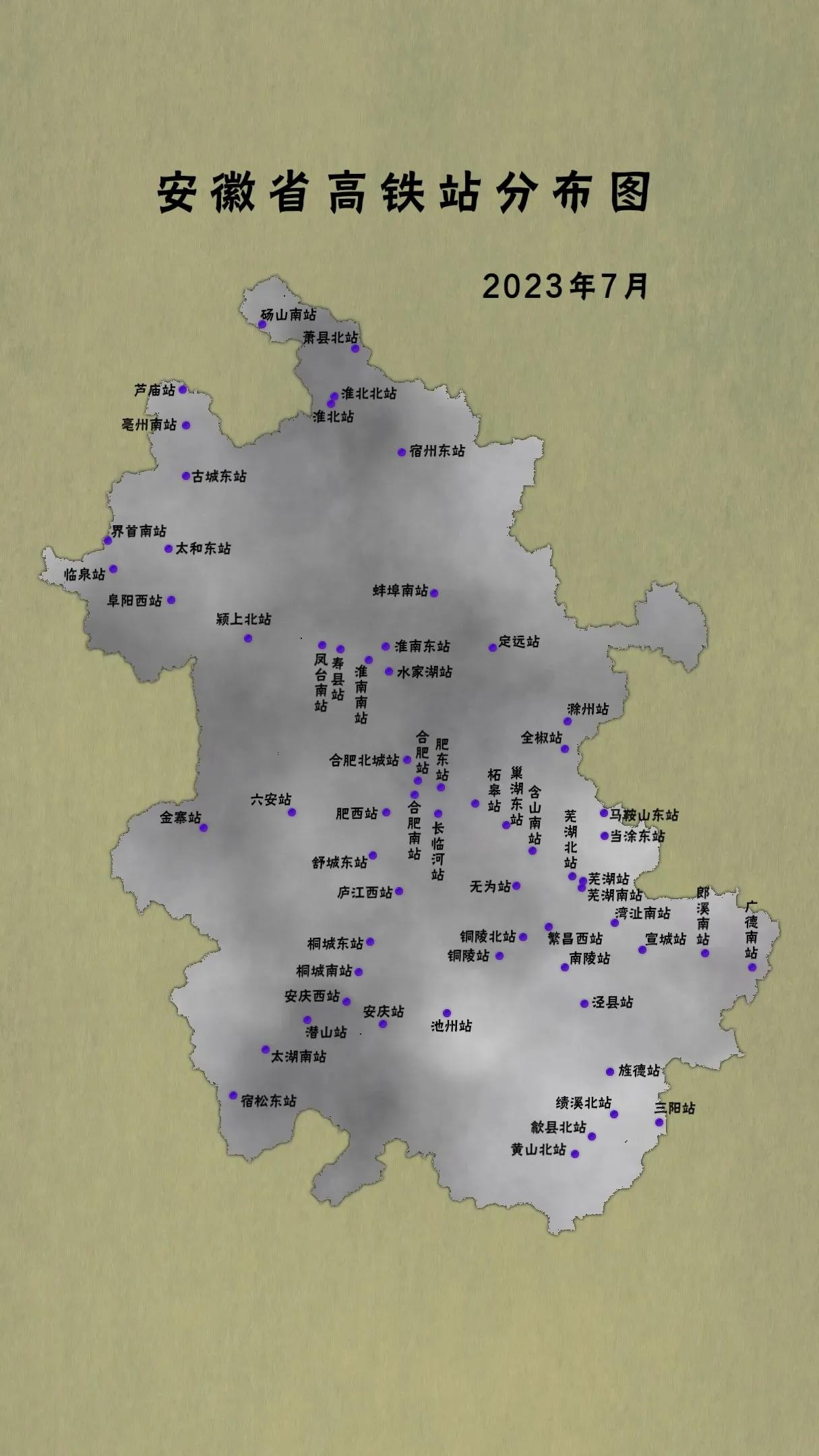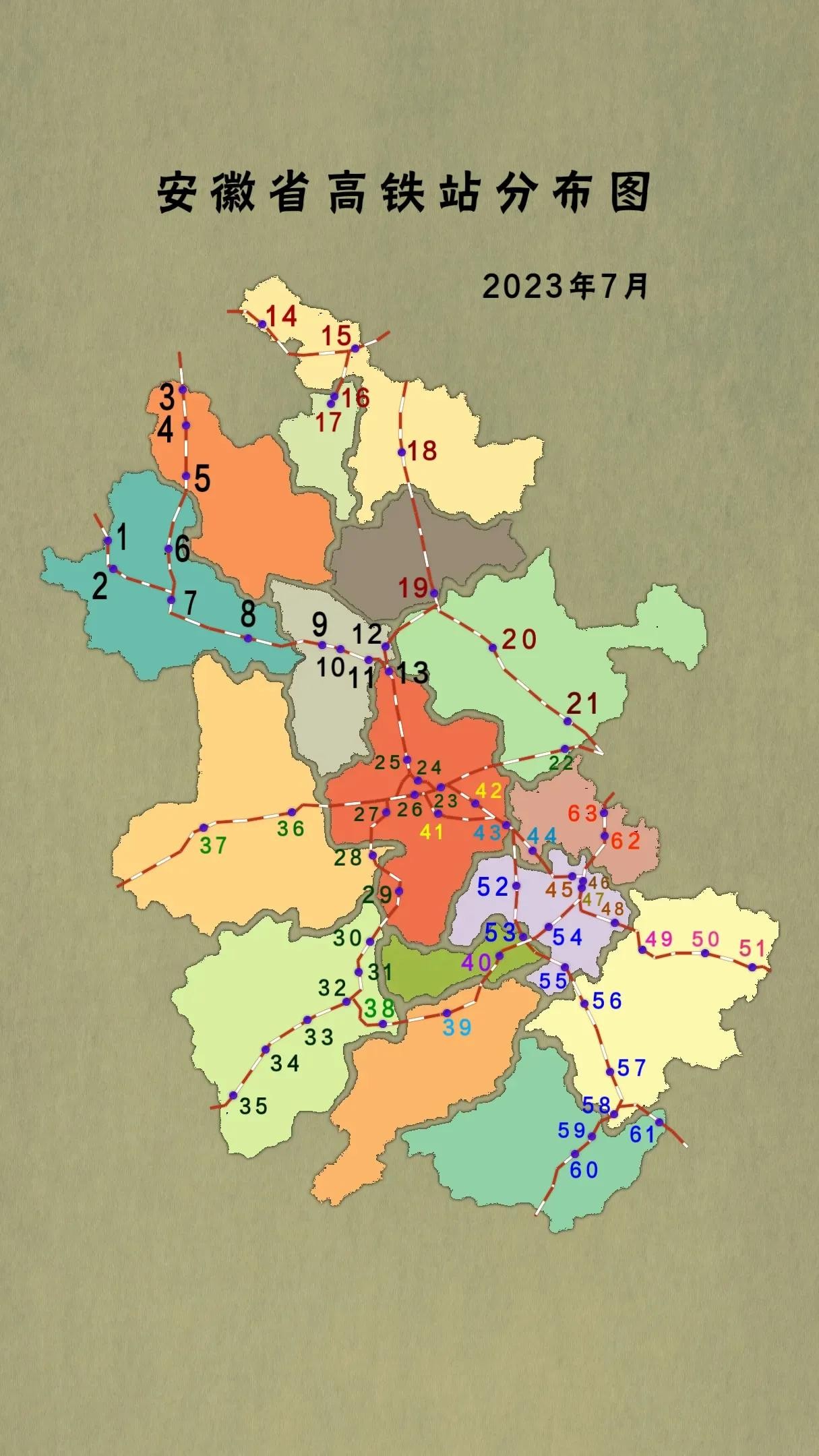 截止到2023年7月,安徽省16个地级市共有63个高铁站
