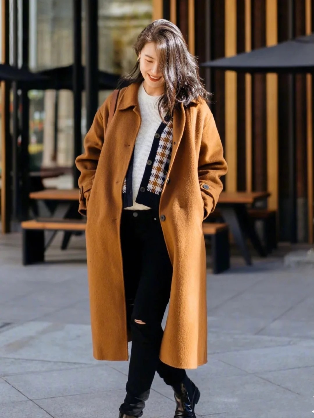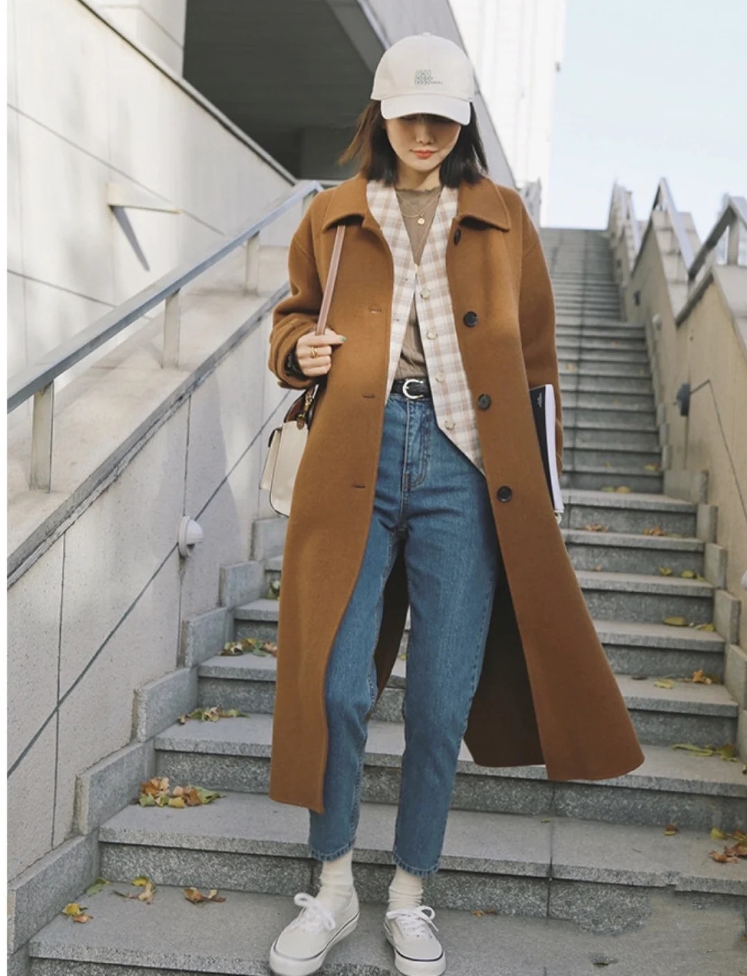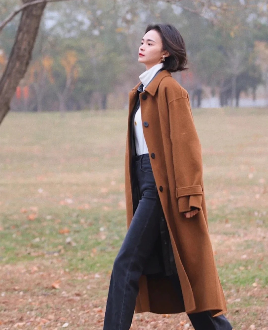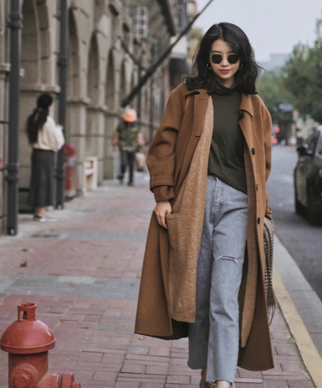 经典的焦糖色大衣,它的暖色调刚刚好,它比深卡其色调更偏黄一些,给人柔和的感觉,很显气色,而牛仔裤自带厚重,浓郁的复古气息和温暖的焦糖色结合在一起,更多了一些成熟气质,很适合成熟的职场女性穿,特别有气场。