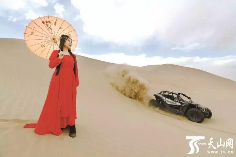 在尉犁县罗布人村寨景区,新引进的娱乐项目庞巴迪全地形越野车与一位身着华服的女子擦肩而过。