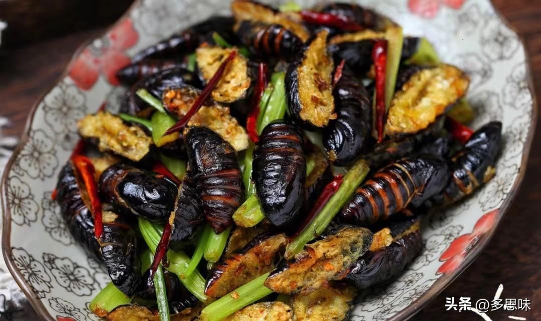 蚕蛹富含蛋白质,干煸口感酥脆越嚼越香,外壳都能吃光光。