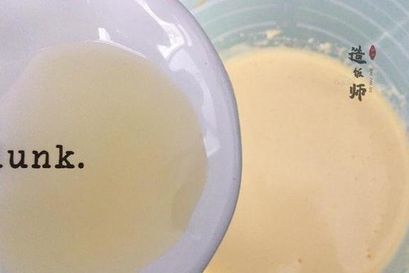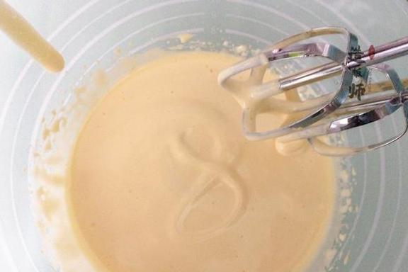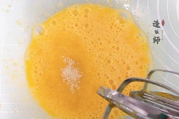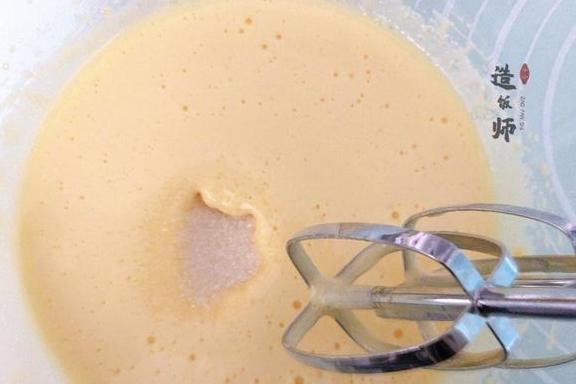 2、第二次放入白糖:打蛋器持续低速打发至蛋液出现密集的小气泡,蛋液颜色变成浅黄时第二次放入白糖。