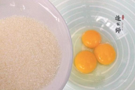 将2个鸡蛋的蛋黄和蛋清分离,2个蛋黄中再打入一个全蛋,分三次放入25克白砂糖,用打蛋器打发至蛋液体积明显变大且颜色变浅。