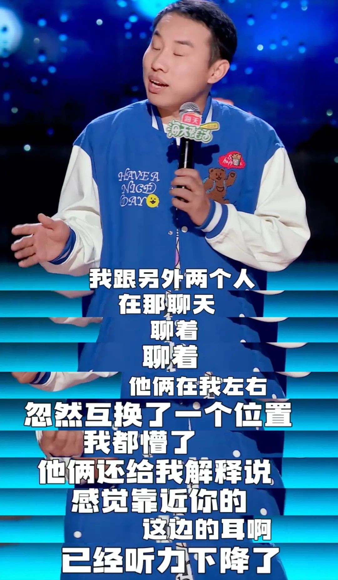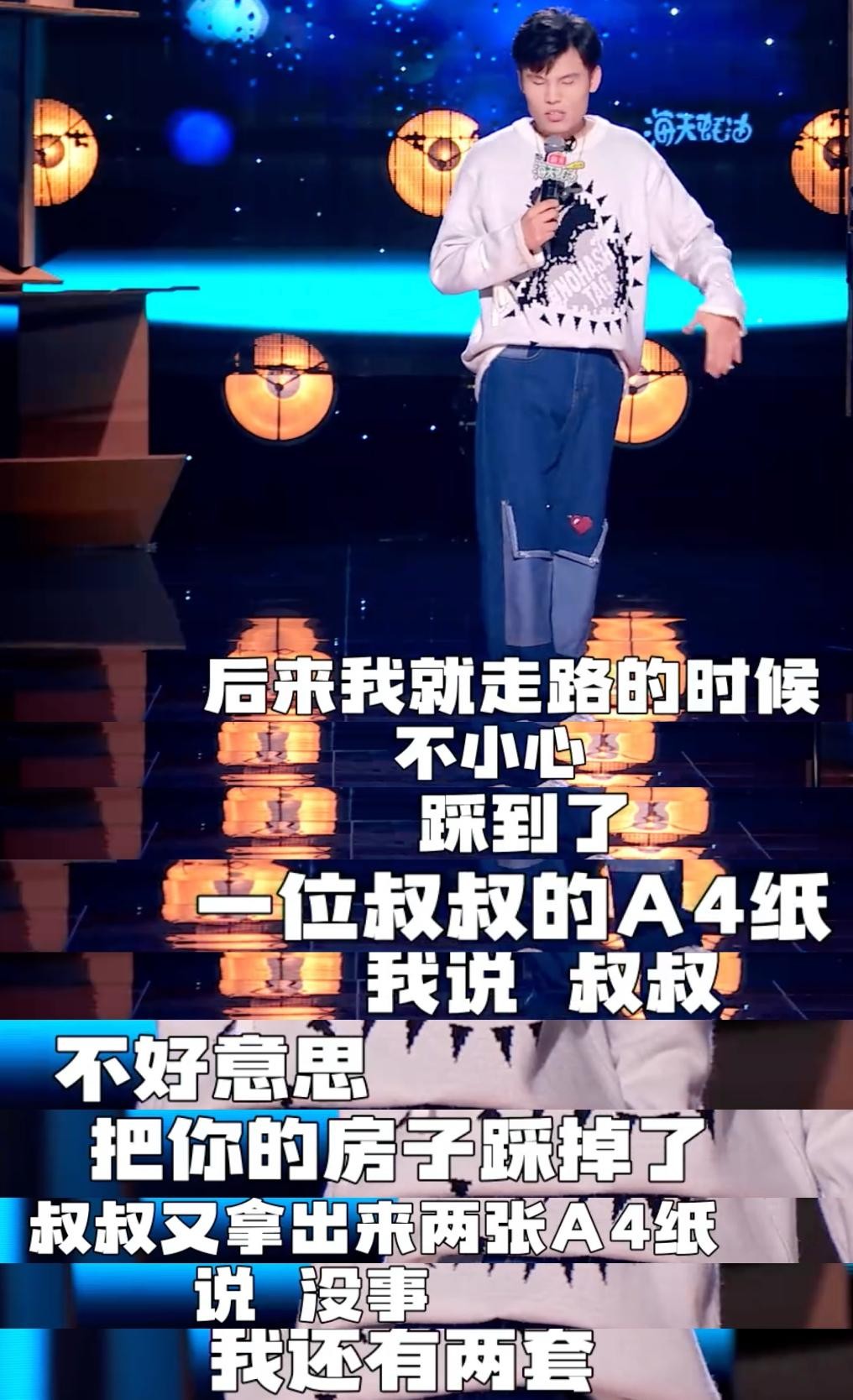 志胜说自己不但爱说话,社交能力强,嗓门也比较大,于是就有以下场景出现,听他讲话的朋友互换了位置,因为靠近他说话的耳朵听力已经下降了。这个包袱之后,志胜就大聊特聊他是如何拍马屁的。所以,整体来说,没有他之前那场的段子好笑。而且这个社牛的状态比当天上场的社恐者鸟鸟来说,还差了些意思。