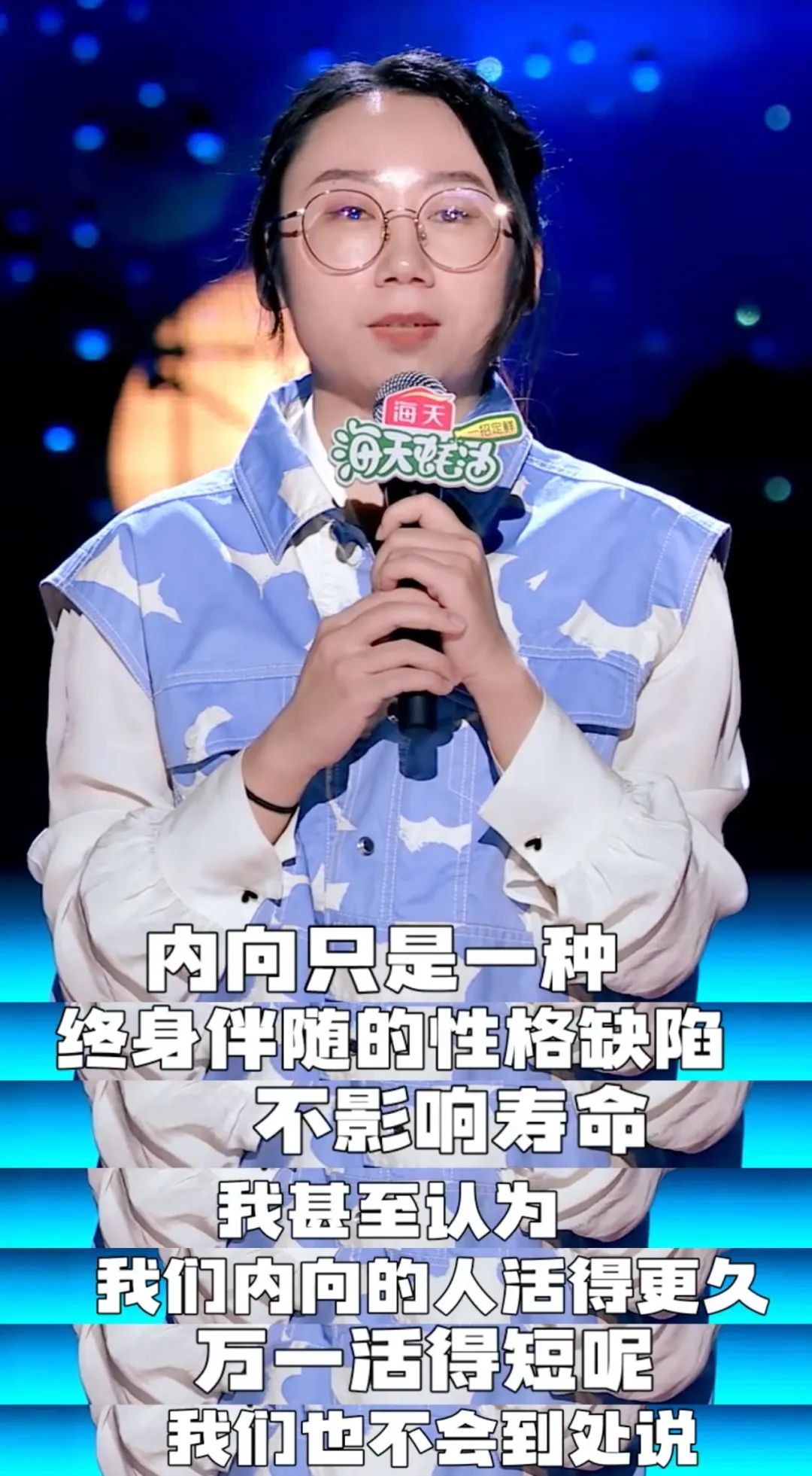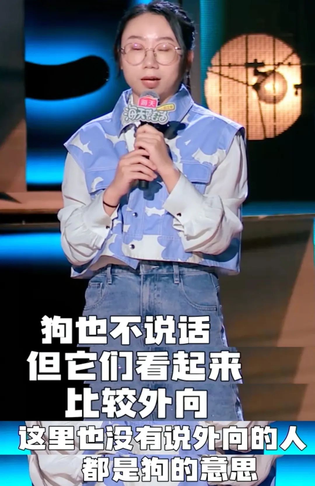 之前看过她表演的观众,应该都记得那股特别丧的状态,以及特别有杀伤力的台词。比如“快乐的人也是要死的”这类风格的语言在这次节目中又再次展现出来,换成了“这里也没有说外向的人都是狗的意思”。就是那种你无法反驳,但好像又被冒犯到的感觉。